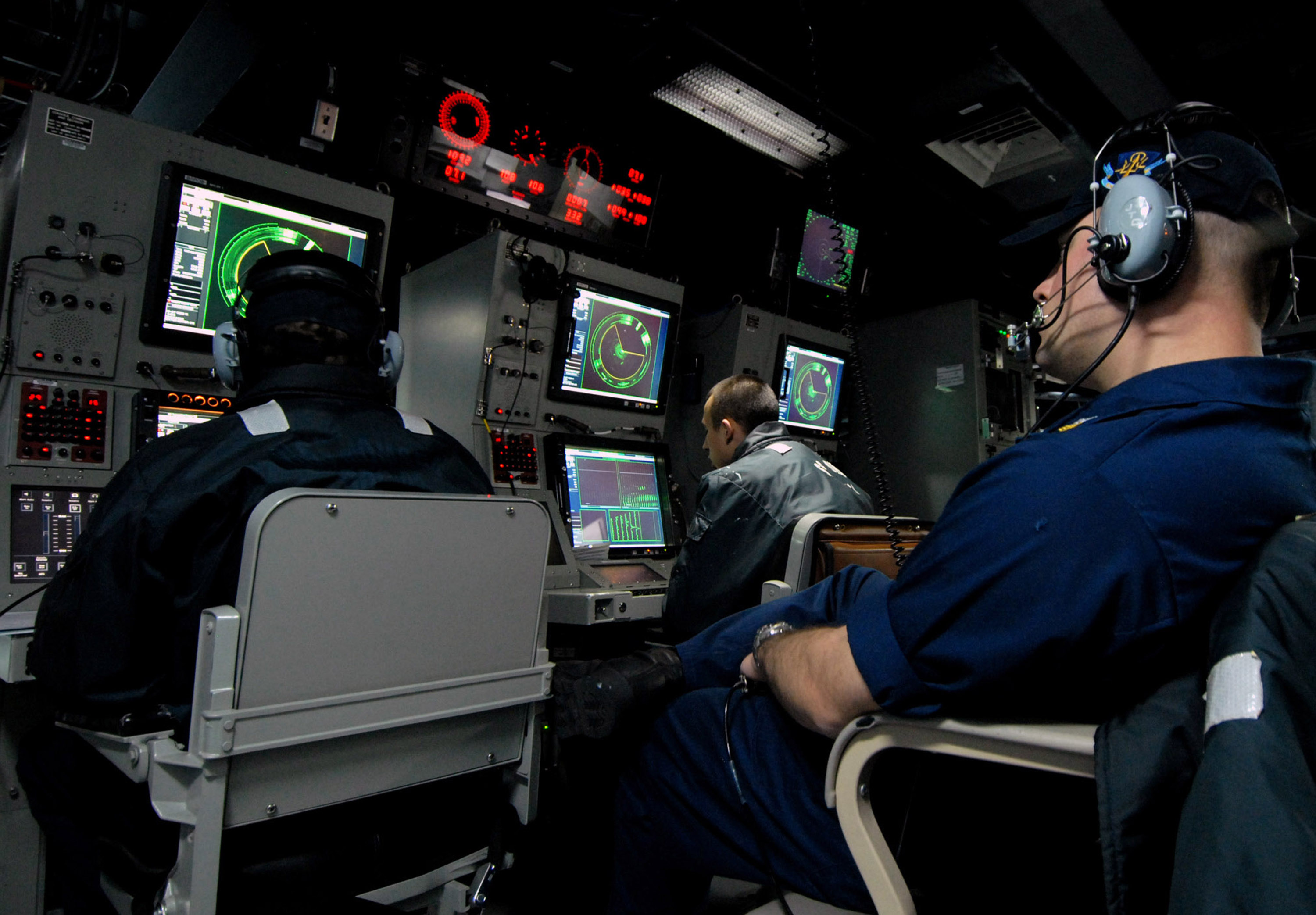 在美国海军提供的一张图片中,声纳技术员在海上监视声纳接触。