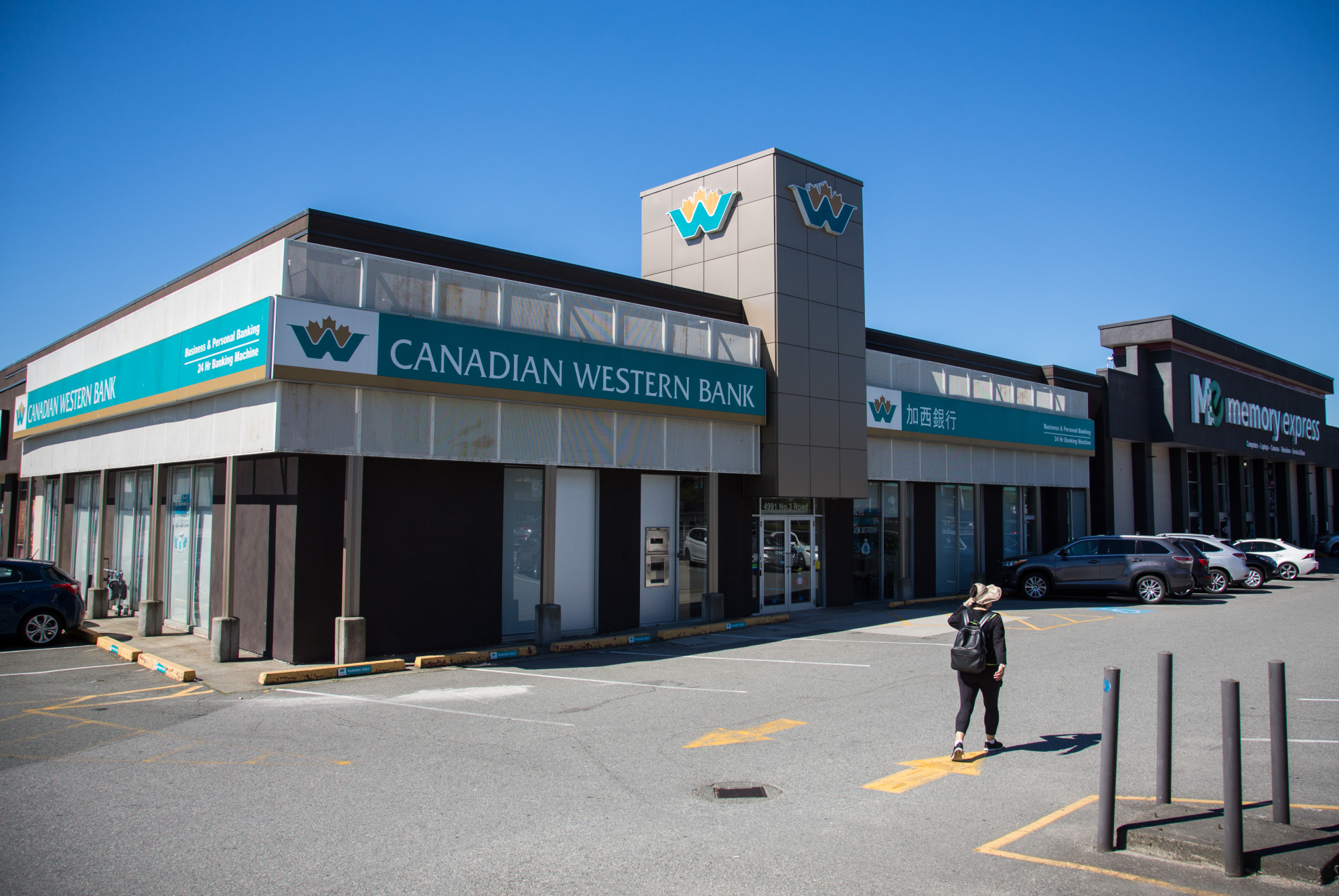 一名行人经过加拿大西部银行在加拿大不列颠哥伦比亚省里士满的分行。