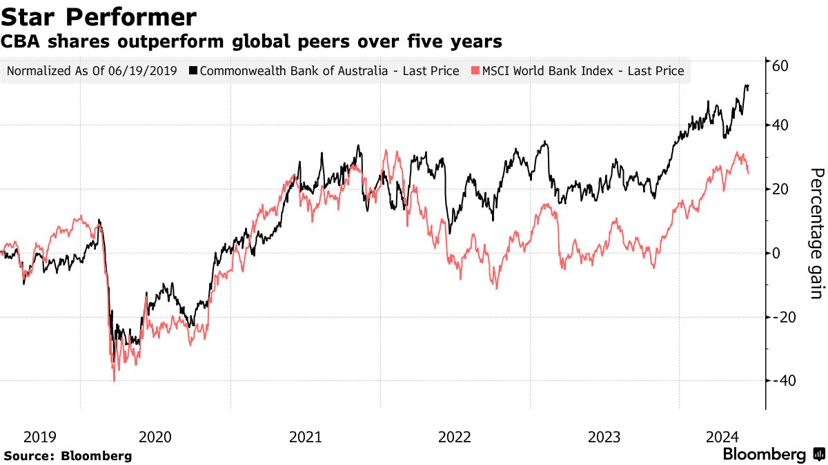 全球范围内的银行股受益于较高的利率,这帮助推动了本月澳大利亚金融股指数创下历史新高。与银行MSCI世界指数的31%相比,澳大利亚联邦银行过去一年回报约为37%。