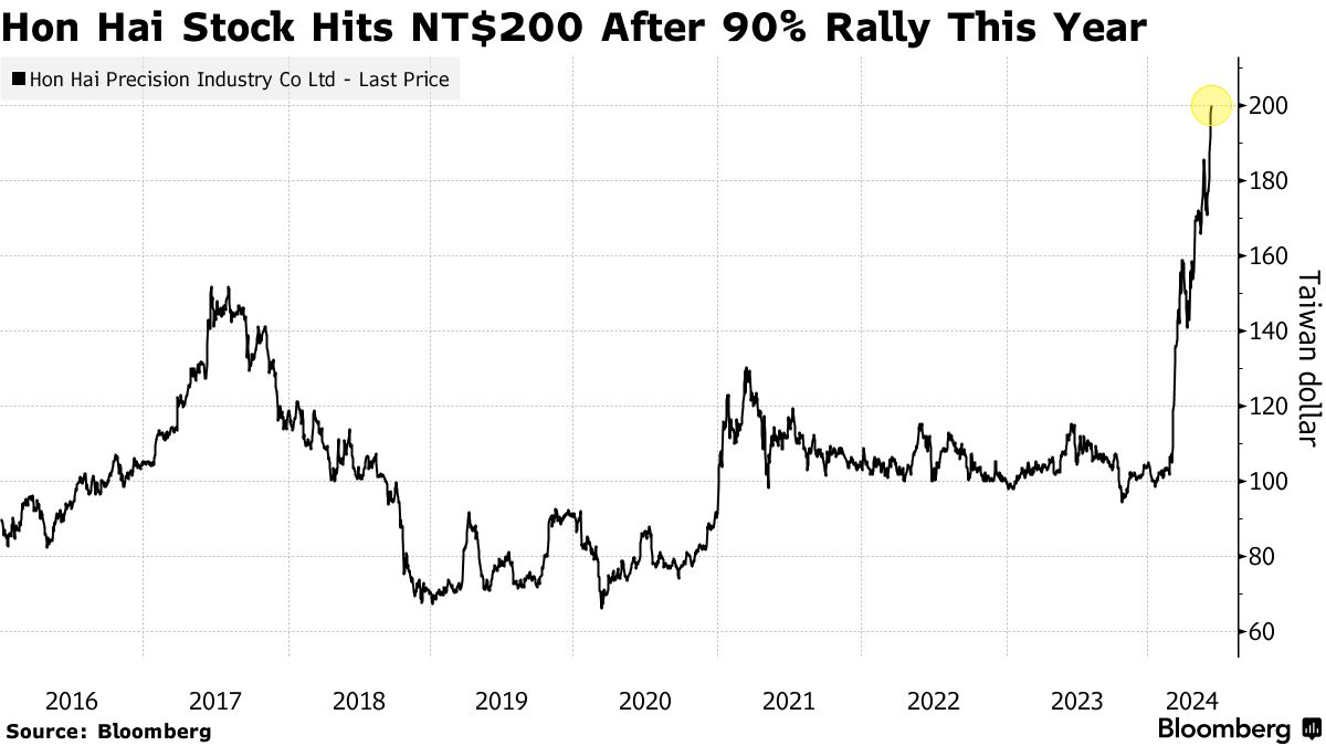 该集团旗下的鸿海精密工业股票周一收盘价达到新台币200元(6.18美元),这是郭台铭在2016年承诺要达到的水平。这只在台北上市的股票今年涨幅超过90%,投资者对人工智能服务器和最新的苹果产品充满热情。
