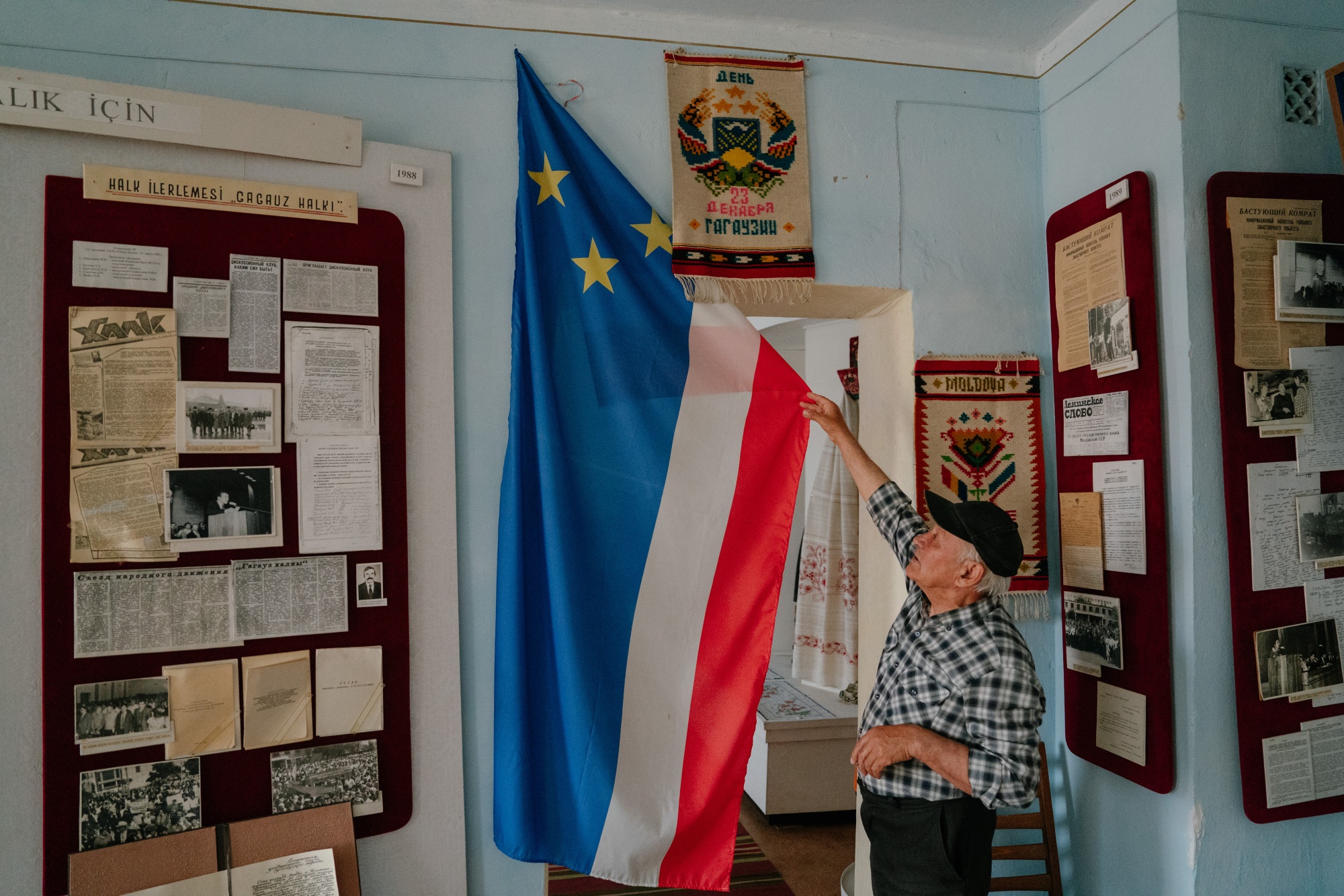格奥尔基·图坎努,科姆拉特地区历史博物馆副馆长,展示了一个加告兹的旗帜。摄影师:Andrei Pungovschi/Bloomberg俄罗斯的明显压力最为激烈地体现在乌克兰,自2014年普京总统占领克里米亚,然后在2022年2月进行全面入侵以来。