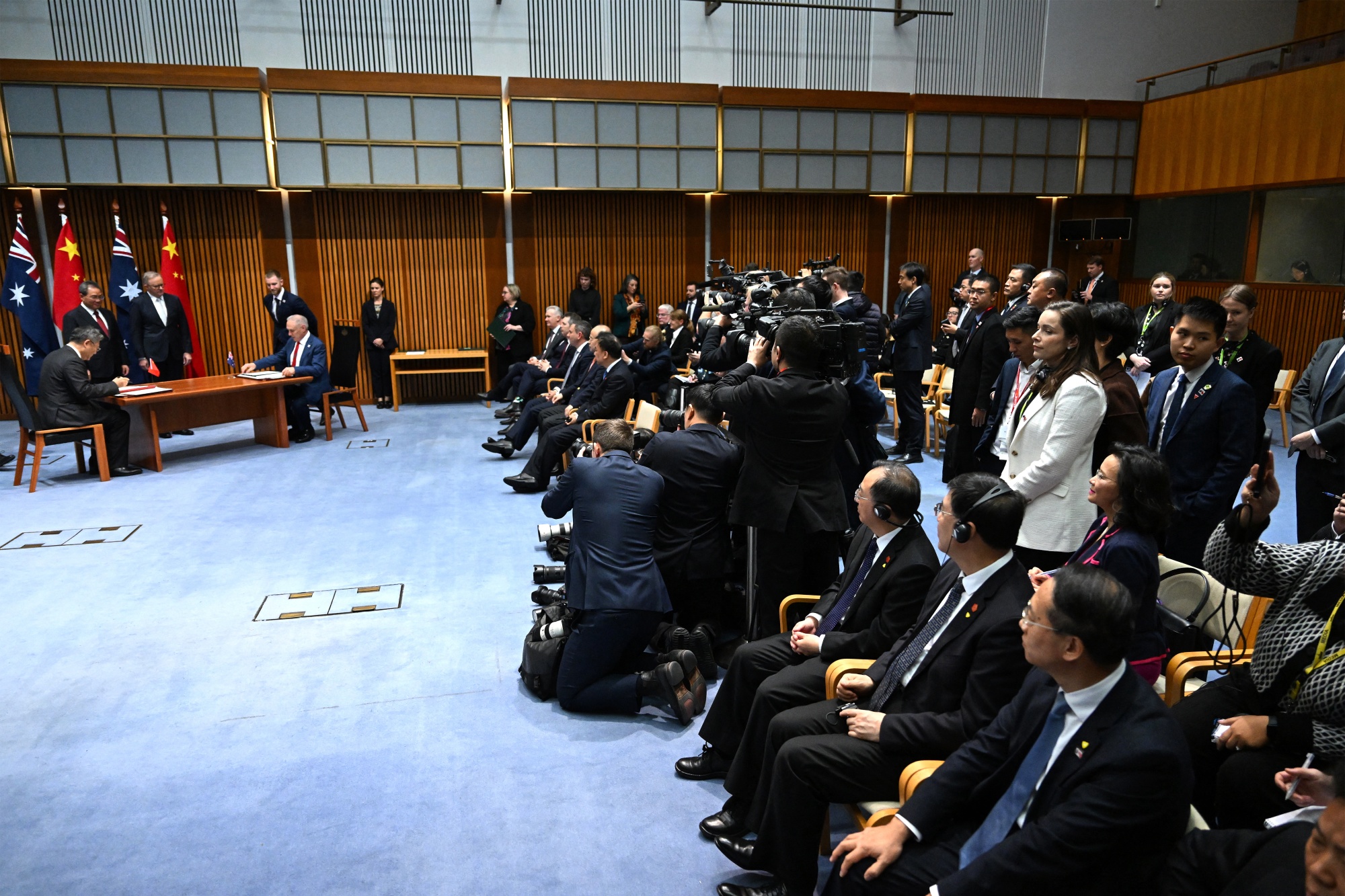 程蕾,坐在右侧第二排,观察了6月17日在堪培拉由李强和安东尼·阿尔班斯签署的仪式。摄影师:卢卡斯·科赫/泳池/法新社/盖蒂图片社澳大利亚央行将利率维持在12年来的高位,并强调通胀持续存在,这表明决策者在准备好发出宽松信号之前还需要一段时间。