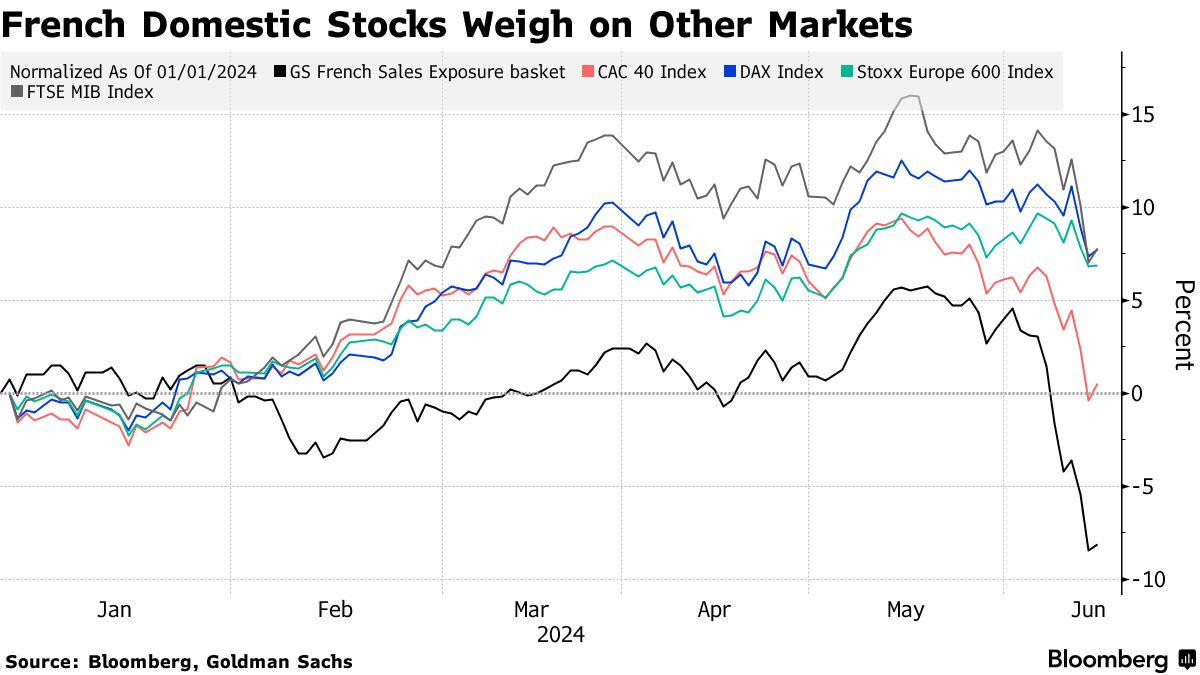 投资者对于马克龙的中间派、亲商业的复兴党在6月30日和7月7日安排的两轮选举中可能会失去更多地位感到退缩。CAC 40在周一反弹,因为交易员在权衡极右翼领袖玛琳·勒庞保证称如果她在选举中获胜将与马克龙合作。