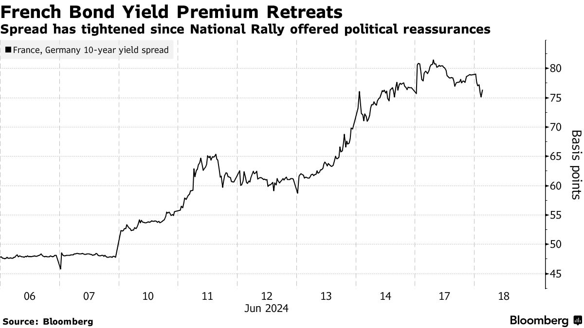 本周的平静开局是在极右翼领袖玛琳·勒庞周末表示,如果她在上周举行的全国选举中获胜,她将与总统埃马纽埃尔·马克龙合作,这一表态使市场陷入动荡之后出现的。