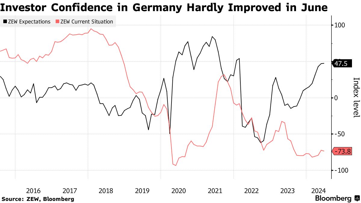 由ZEW研究所发布的预期指数在6月份从5月份的47.1上升到47.5。尽管这是连续第11个月的增长,但仍低于彭博调查中预测的50。当前状况指数略有下降,与预期的上升相悖。