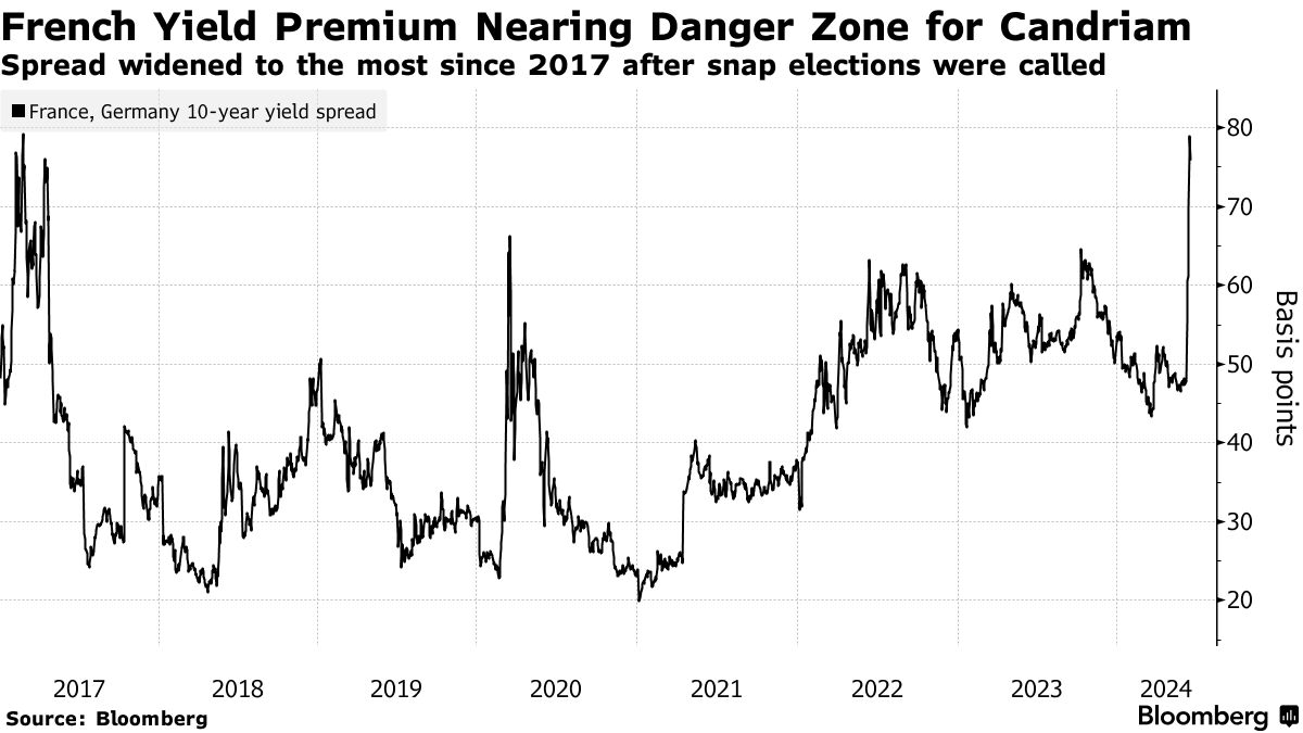 自法国总统埃马纽埃尔·马克龙宣布临时选举以来,法国债券已经下跌,使其收益率溢价超过避险的德国债券79个基点,达到周二的最高水平,自2017年以来最高。更高的收盘价将使其达到自2012年欧元区主权债务危机全面爆发以来的最高水平。
