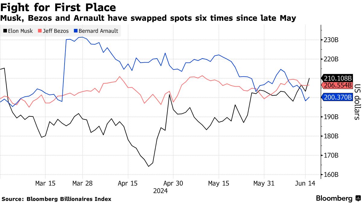 埃隆·马斯克、杰夫·贝索斯和伯纳德·阿诺在彭博亿万富翁指数上的前三名已经占据了全年的94%。但是,他们财富的波动导致这三人自5月29日以来已经六次交换了位置 —— 这对于一个自马斯克在三月初失去头衔以来基本保持稳定的等级来说是一个疯狂的速度。失去了他的头衔。
