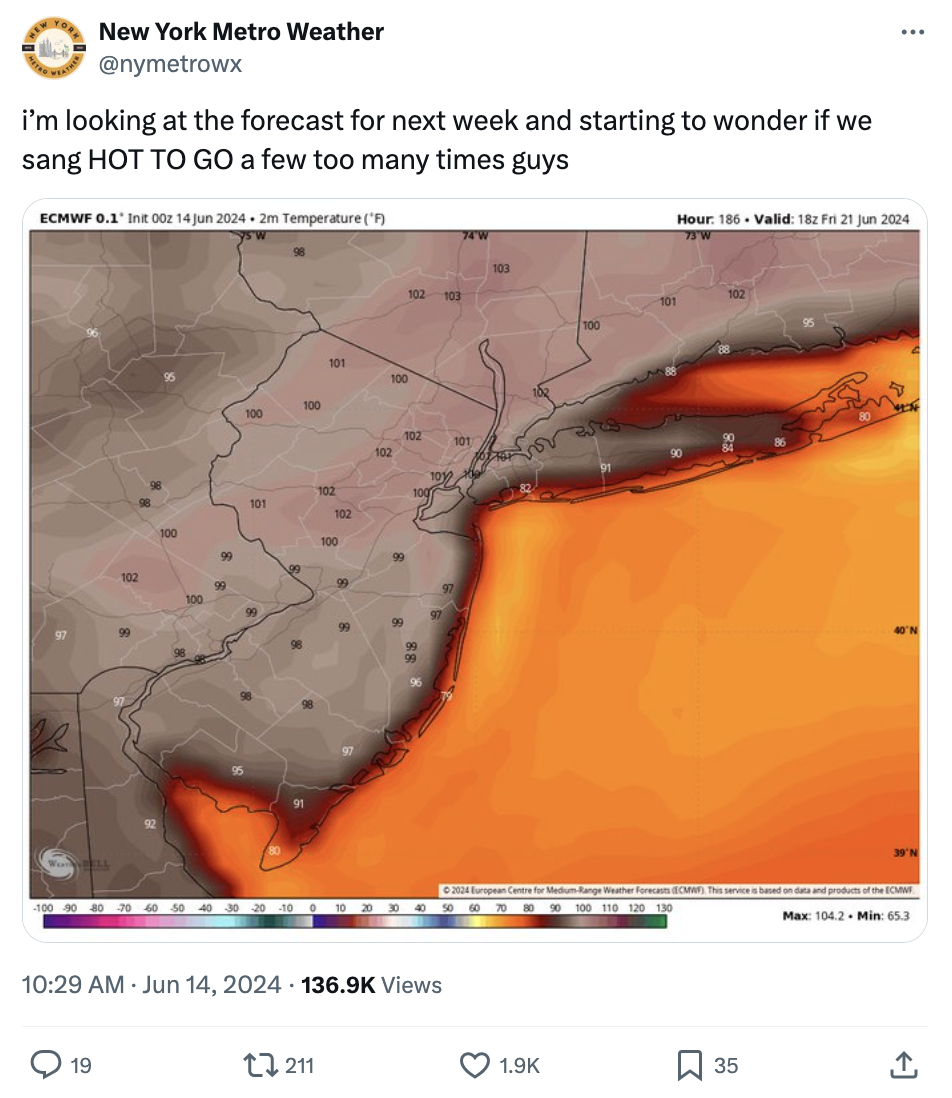 Mark Gongloff 表示,已经烤熟了墨西哥和美国西南部几个月的可怕的“热块”正在向中西部、东北部和加拿大蔓延。近1.5亿人即将被烤熟,Mark写道:“我们将在工作服里出汗,为了开空调而增加电费。道路和人行道将会破裂。纽约市周围的Amtrak和公共交通将失去他们可靠表现的完美声誉(是的,这是讽刺),因为铁路轨道会扭曲,电线会下垂。”
