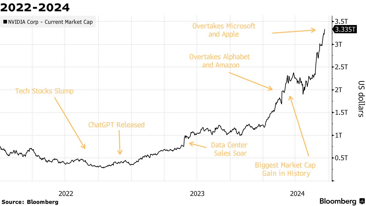 周二,英伟达超越了微软公司,成为市值达到3.34万亿美元的全球最有价值的公司。