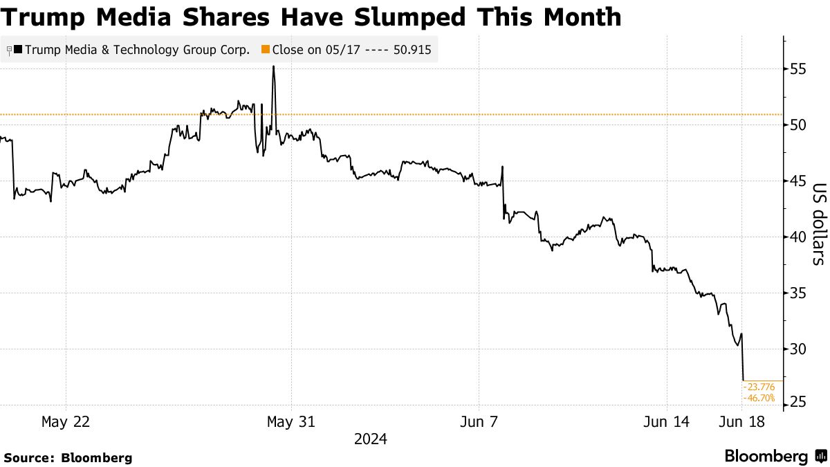 特朗普媒体拥有Truth Social,自今年早些时候上市以来一直波动不定,股价在首次上市后的几天飙升至79.38美元,之后在几周后跌至22.55美元。