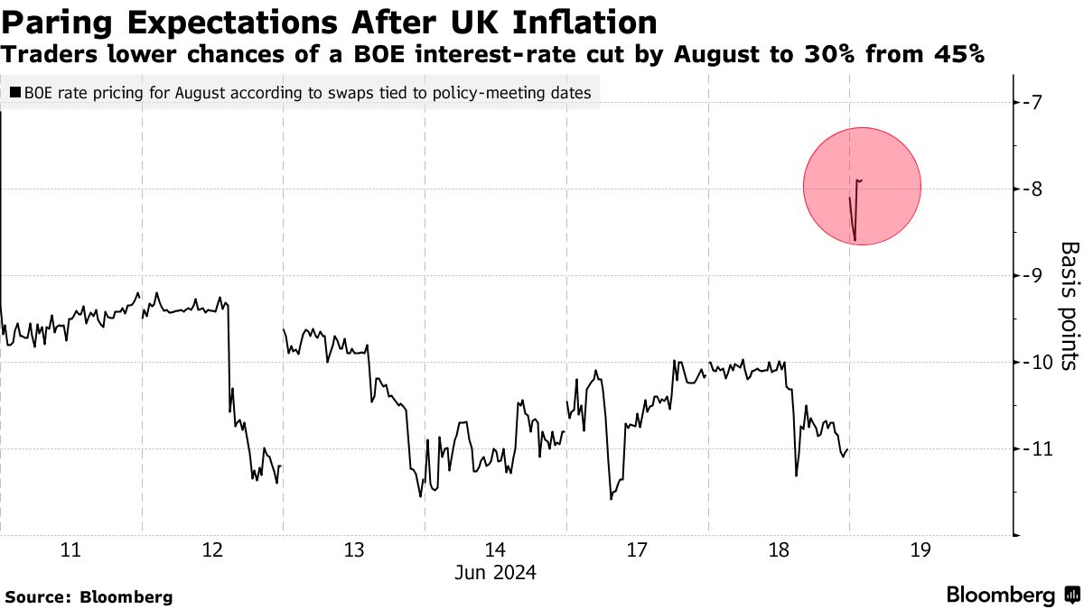 货币市场现在预计英格兰银行在8月降息的可能性为30%,而数据发布前为45%。今年已经有一个四分之一点的降息被完全定价,将在11月实施,第二次降息的可能性为60%,而周二时为80%。