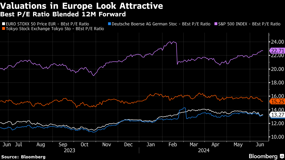 欧洲股市的有利因素包括经济前景的 改善,以及欧洲央行开始实施降息周期,尽管它持谨慎态度。值得注意的是,欧洲斯托克斯50指数的盈利增长,在2024年第一季度同比增长了2.5%,高于2023年第四季度不到1%的水平。这些盈利超出了预期,基于市盈率的估值与其他发达市场指数相比仍然具有吸引力。