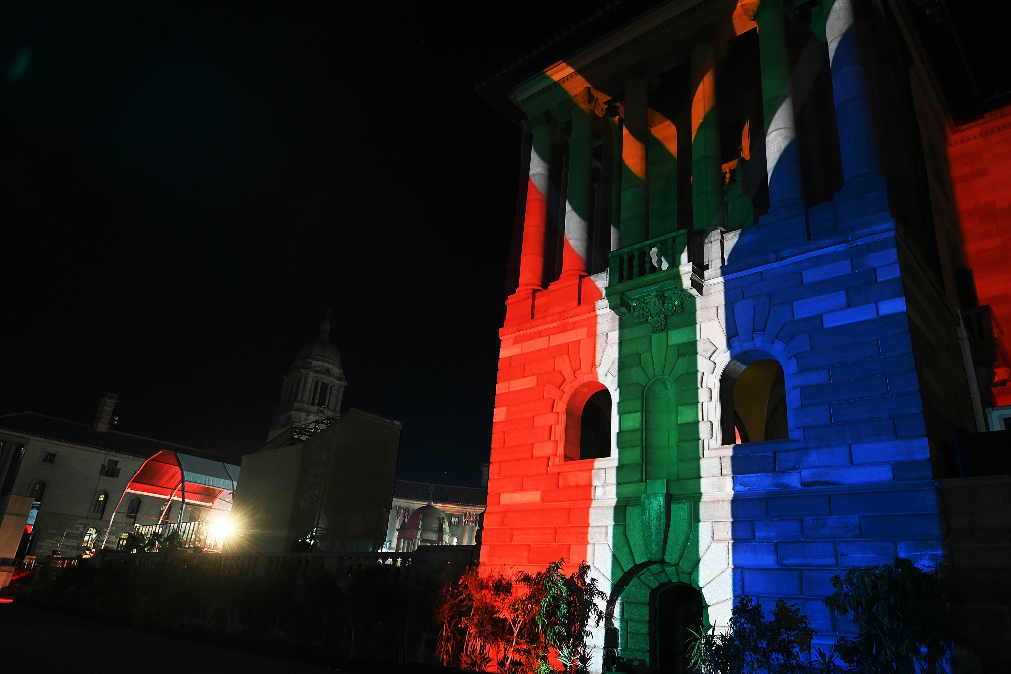 南非总统就职典礼前,比勒陀利亚出现南非国旗的光影投射,时间为6月19日。