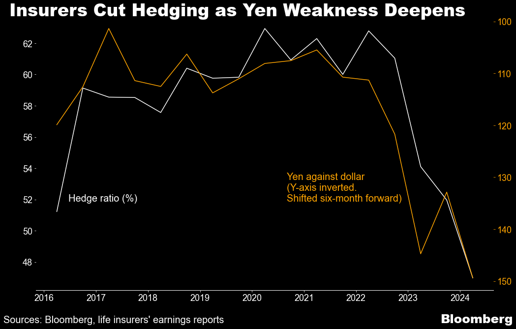 USD/JPY:随着日元疲软加剧,保险公司减少对冲 - 彭博社
