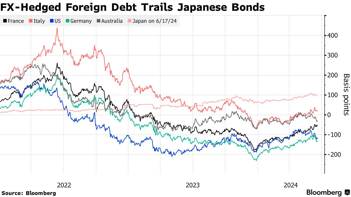 然而,短期利率之间存在较大差异,使得货币保护成本居高不下,购买带有对美元下跌的保护的外国债券成为亏损的提议。对于日本投资者来说,十年期国债的收益率为负1.2%,而没有保护措施的话为4.22%。