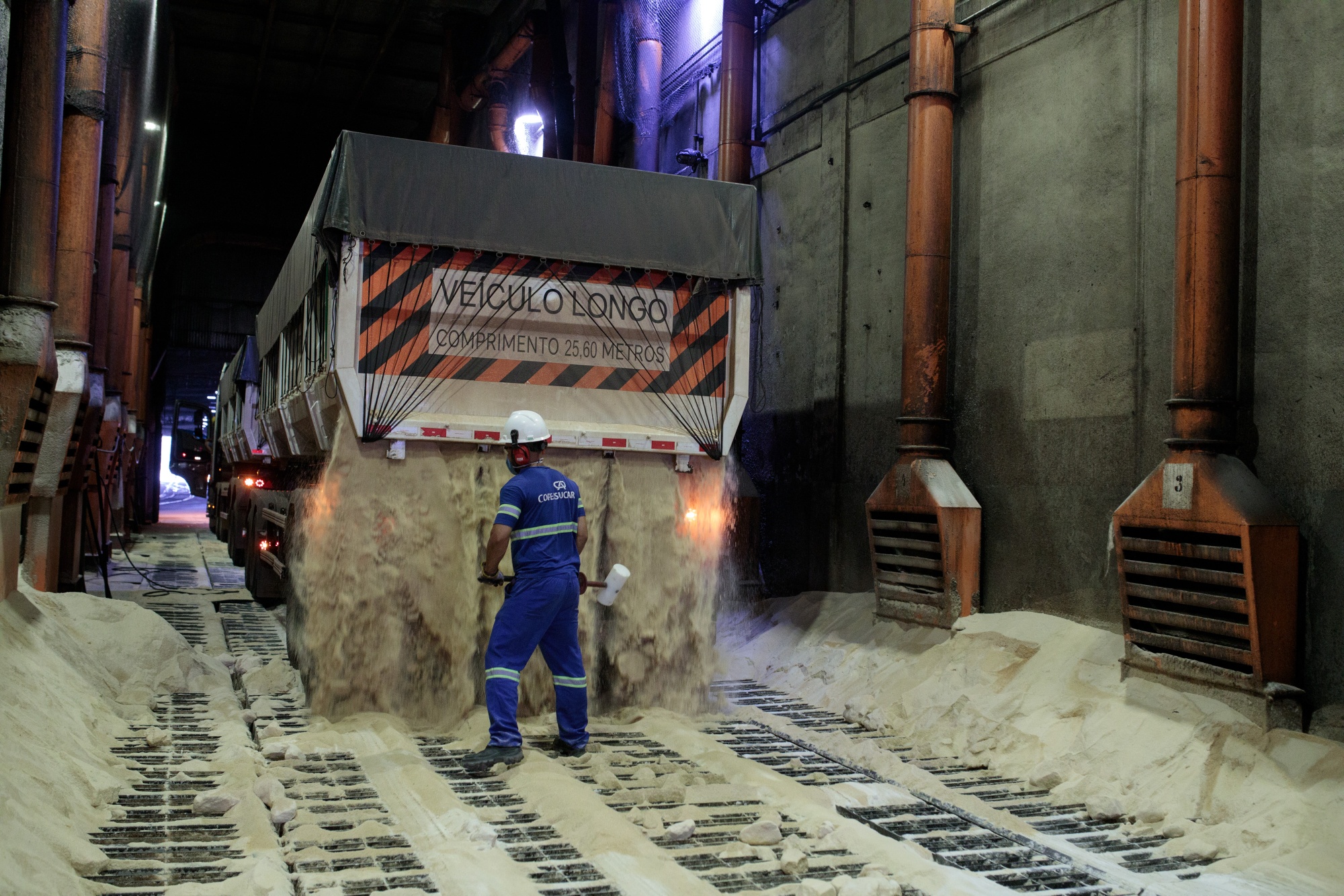 一名工人在巴西圣保罗的Copersucar码头从卡车上卸下糖。