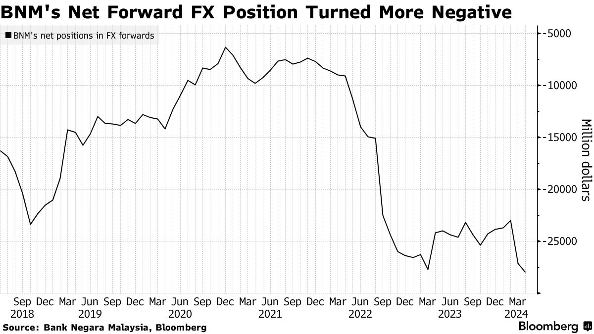 虽然马来西亚国家银行的净远期外汇头寸变得更为负面,但该国总外汇储备在5月底为1136亿美元,与2023年底几乎持平。