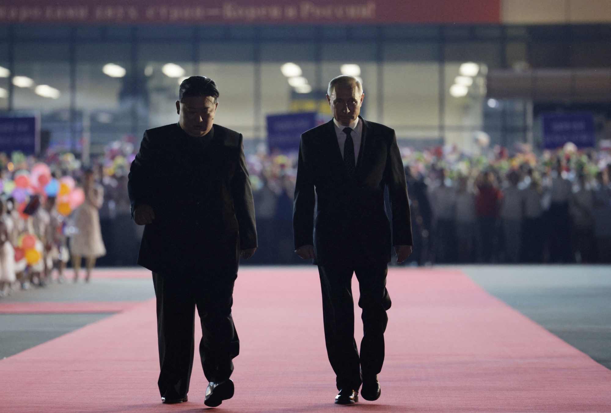 在俄罗斯国家通讯社斯普特尼克(Sputnik)分发的一张照片中,右边是弗拉基米尔·普京,与金正恩在平壤,6月19日摄影师:加夫里尔·格里戈罗夫/斯普特尼克/法新社/盖蒂图片社俄罗斯总统弗拉基米尔·普京和朝鲜领导人金正恩同意在其中一方遭受攻击时立即提供军事援助,重新启动自冷战时期的一项协议,这一举动可能会使美国及其盟友感到不安。