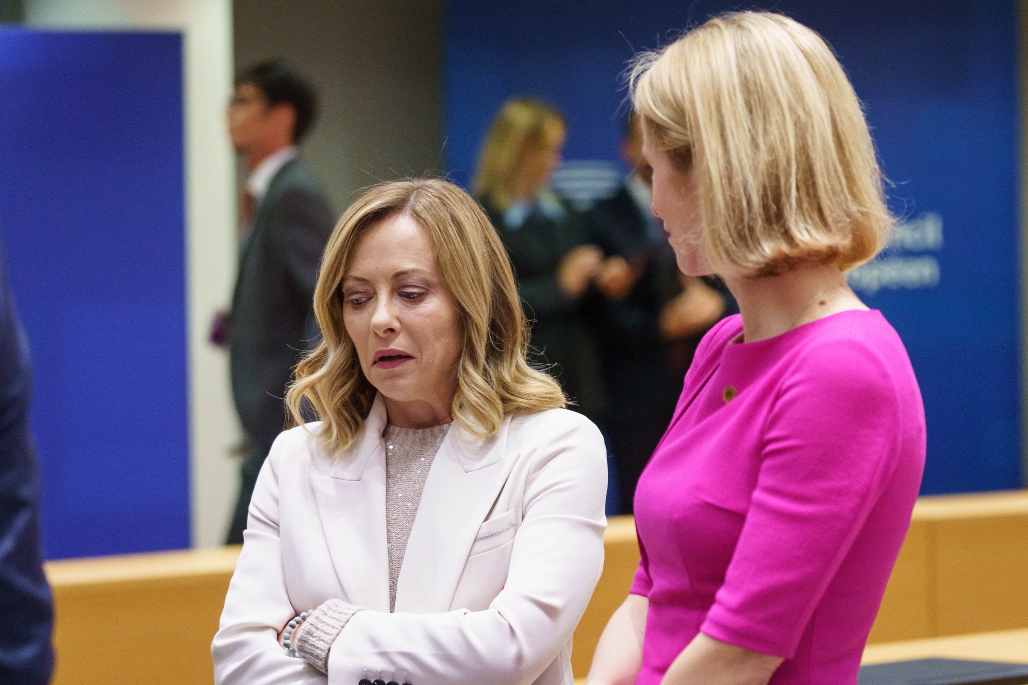 乔尔贾·梅洛尼,意大利总理,左边,和卡亚·卡拉斯,爱沙尼亚总理,右边摄影师:西蒙·沃尔法特/彭博社