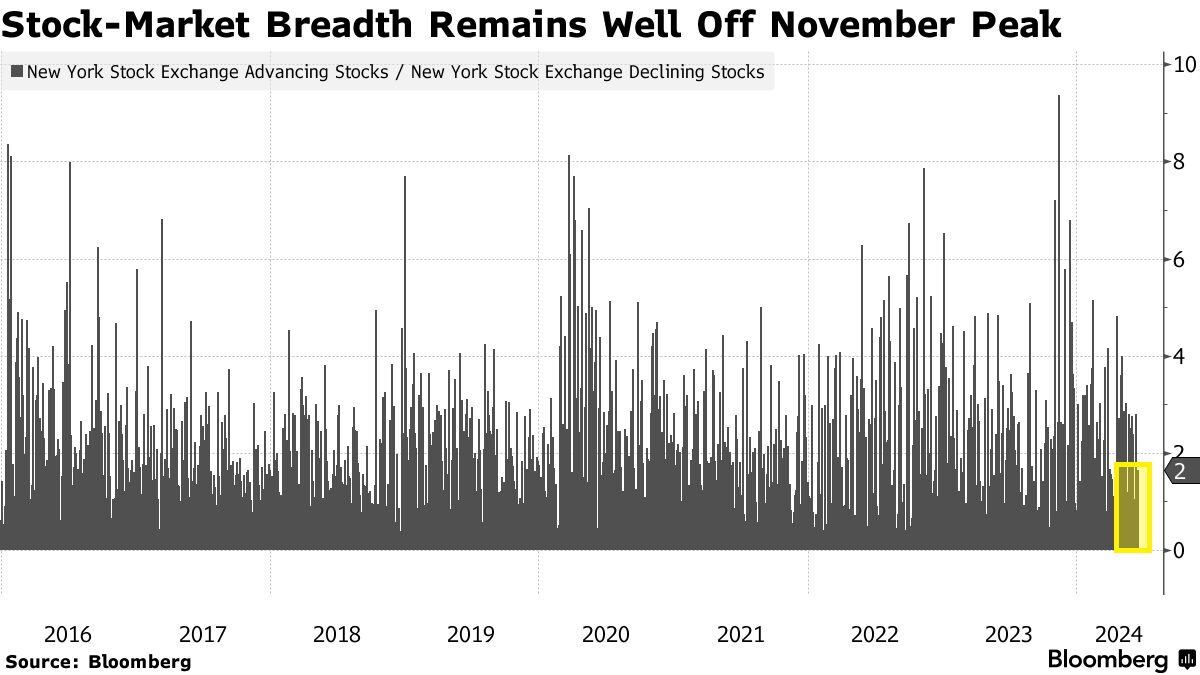 剔除那些不断推动标普500指数创历史新高的几家大型科技公司,看起来引擎正在燃烧殆尽。虽然指数从一个纪录向下一个纪录前进,但越来越少的股票参与了今年的涨势。彭博社截至上周末编制的数据显示,近三分之一的成分股在过去一个月内创下了一个月内的新低点。创新高的股票数量远远超过了推动指数上涨的股票。事实上,只有3.2%的股票创下了一个月的新高,其中包括苹果公司和高飞的英伟达公司,后者刚刚超过微软公司成为全球市值最高的公司。