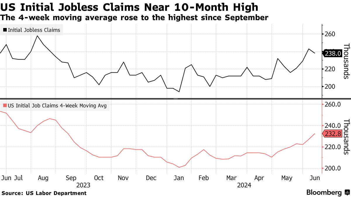 根据周四发布的劳工部 数据,截至6月15日的一周内,首次申请人数减少了5,000人,至238,000人,此前一周达到了10个月来的高点。在彭博调查的经济学家中值预测为235,000人。