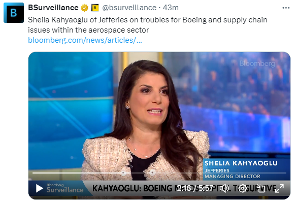 一位航空分析师对波音公司的诸多问题进行了评估,涵盖了双通道飞机到窄体737 Max再到宇宙飞船:Jefferies的Sheila Kahyaoglu对于飞行新飞机并不担心,但其生产问题使航空公司不得不使用老式飞机。她对不得不乘坐波音757进行横跨大西洋的旅行感到不满,该机型已于2004年停产。