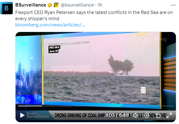 随着也门胡塞叛军继续袭击红海航运,迫使海员走更长的航线,全球开始感受到通胀压力再次渗入供应链,Flexport首席执行官Ryan Petersen表示。他说:“这是每个人都在关注的问题。”一段散货船被海上无人机击沉的视频走红。