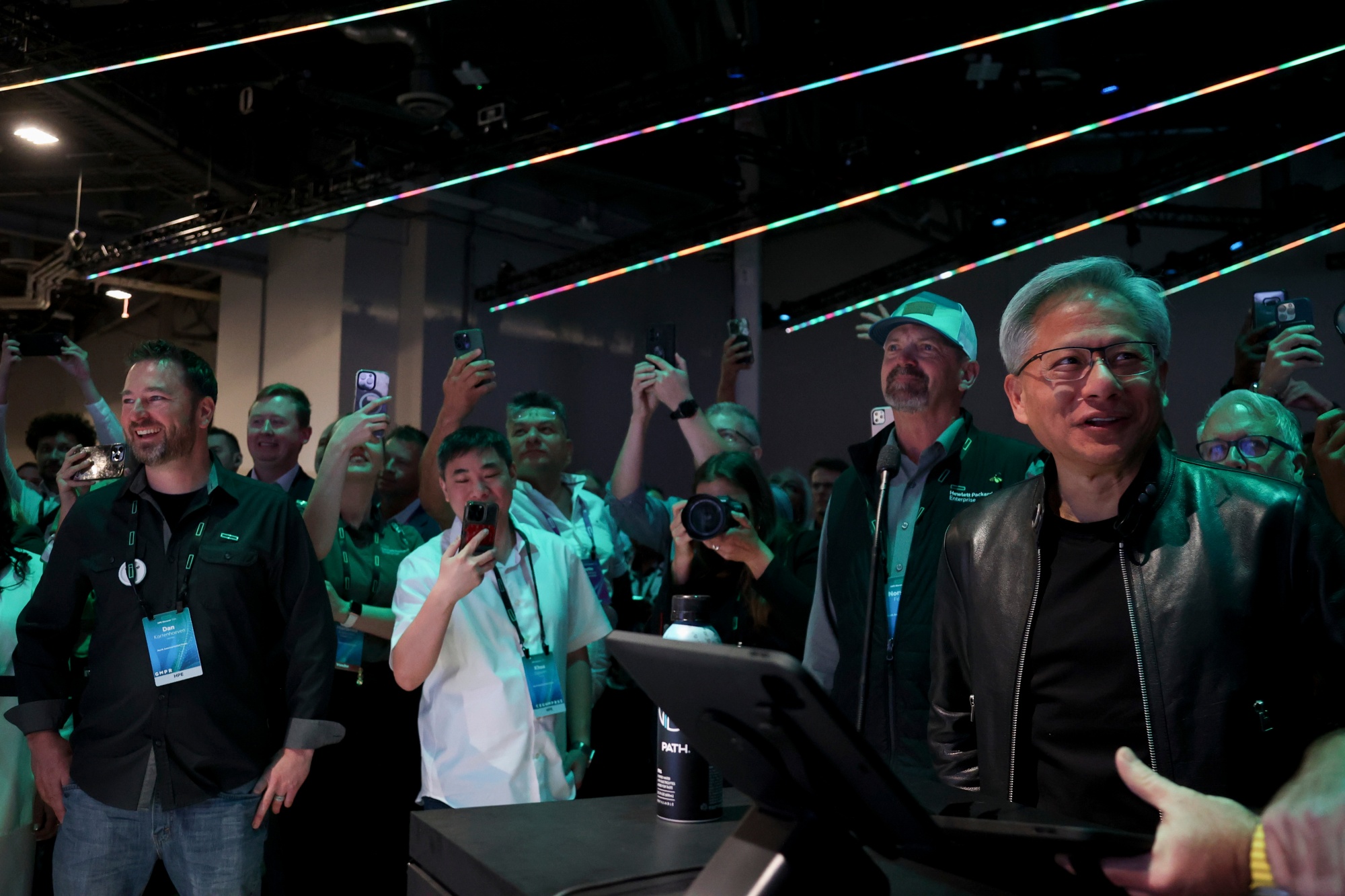 黄仁勋,Nvidia首席执行官,在拉斯维加斯的HPE Discover活动中与人工智能系统交谈。