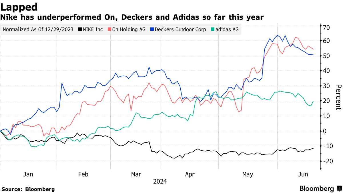 曾经备受喜爱的耐克,失去了粉丝,因为它与On Holding AG、Deckers Outdoor Corp.’s Hoka和Adidas AG等竞争对手抗衡。周四,花旗分析师保罗·勒吉斯在一份备忘录中表示,阿迪达斯在北美、中国和欧洲持续在追赶耐克。
