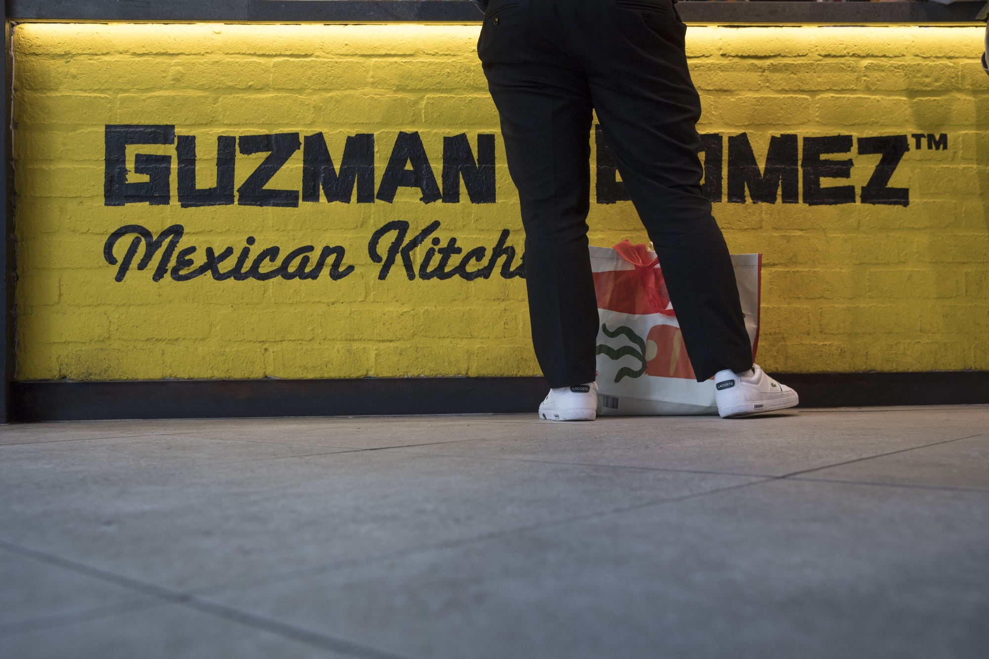 一位顾客在悉尼的Guzman y Gomez餐厅排队。