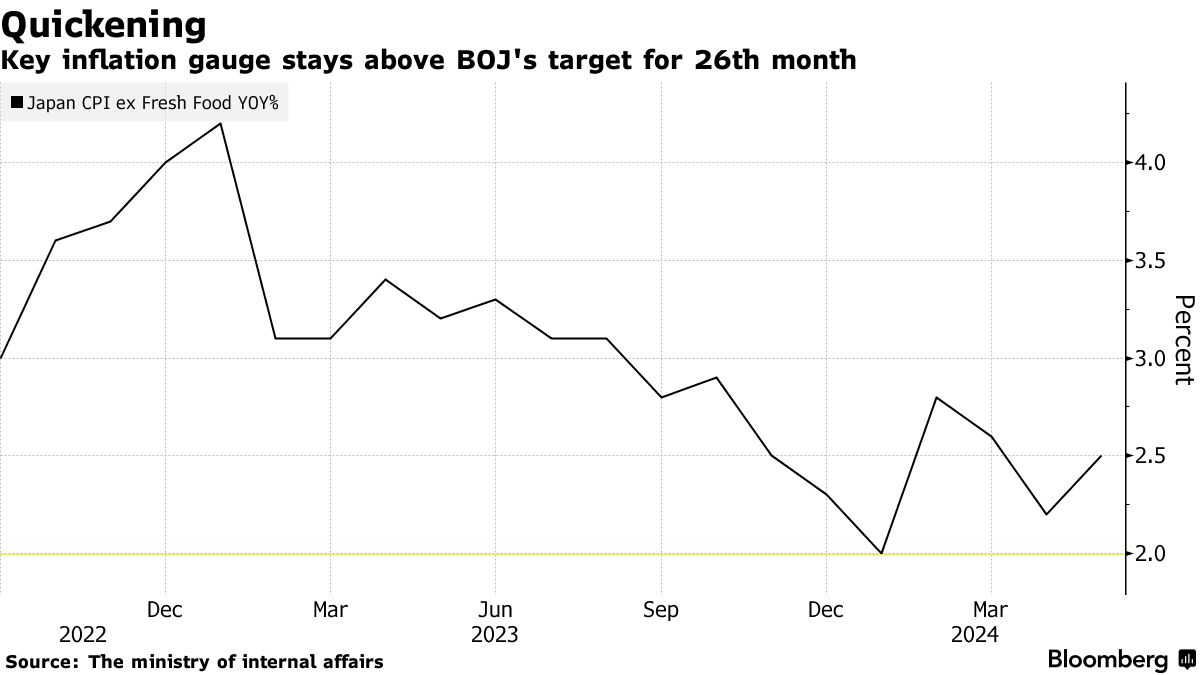 不包括生鲜食品在内的消费者价格从去年5月上涨了2.5%,比4月的2.2%加快,内政部周五表示。这一数据略低于经济学家的共识,但仍保持在或高于日本央行的2%目标水平,已经连续26个月。