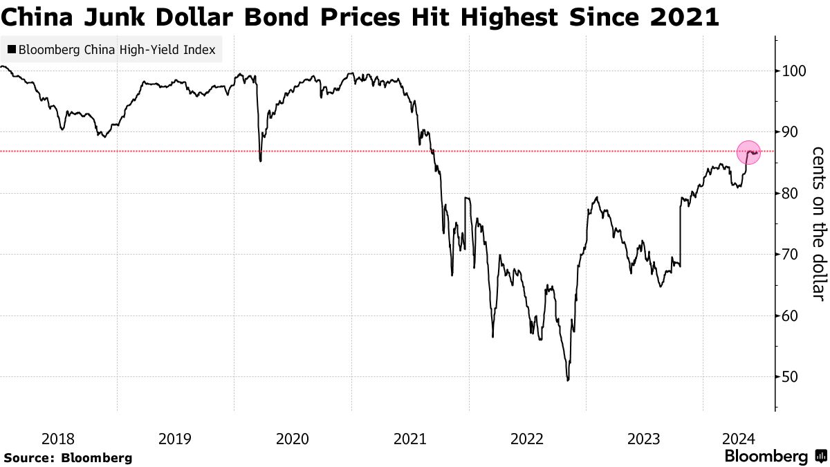 近几个月来,中国政府加大了救助负债房地产行业的措施,包括放松抵押贷款规定,并要求地方政府购买未售出的房屋。这帮助了彭博中国高收益美元债券指数,该指数在总回报基础上将迎来第八个月的涨势,这是近五年来最长的连续赢得期。