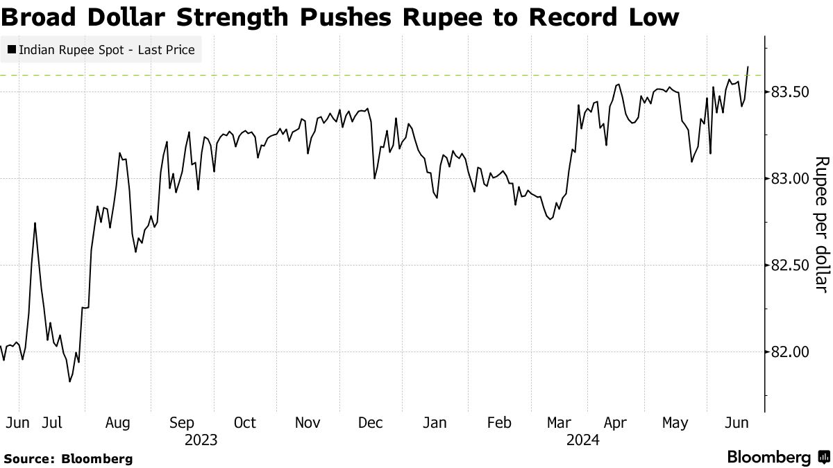 卢比兑美元创下历史新低,就在摩根大通旗舰新兴市场债券指数纳入本地债券之前的一周。随着交易员预期美国的利率将长期保持较高水平,美元普遍走强。但印度储备银行也许也允许货币创下新低,可能受到人民币贬值的影响。正如我的同事Ronojoy Mazumdar指出的那样,决策者通常担心如果货币在相对价值上过于强劲会对出口产生影响。