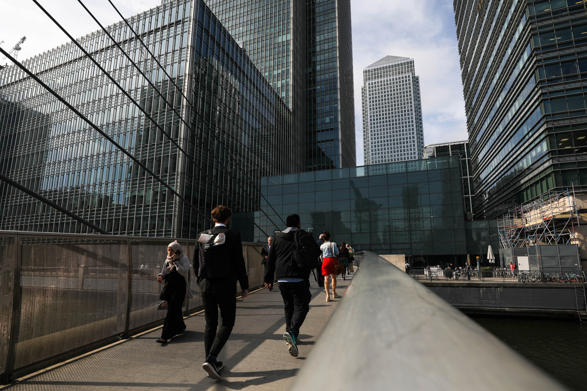 行人穿过通往伦敦金丝雀码头的人行天桥。