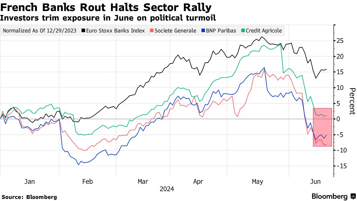 摄影师:Ludovic Marin/AFP/Getty Images在2024年的大部分时间里,欧洲银行股票一直是该地区股市上涨的领头羊。然后,法国总统埃马纽埃尔·马克龙搅乱了这一局面。