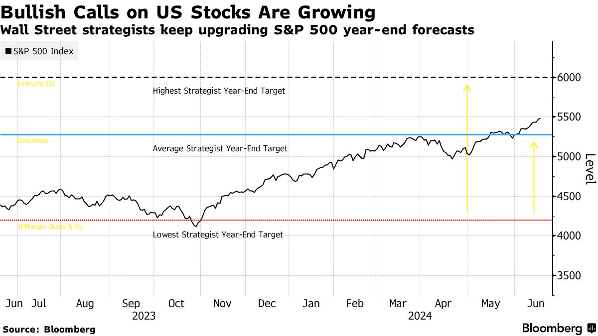 本周,美国股市再次创下历史新高,Nvidia市值达到3.3万亿美元,短暂超过微软公司成为全球最大公司。包括高盛集团在内的一系列华尔街策略师最近提高了对标普500指数的年底目标。