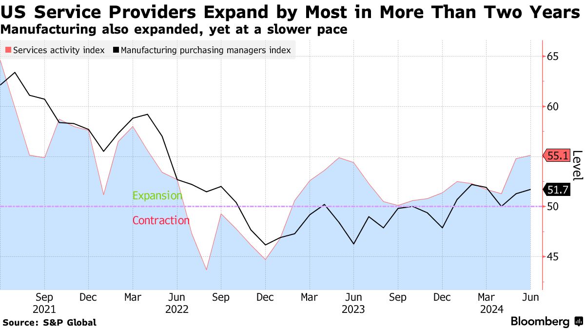标准普尔全球6月服务业活动指数(flash)上升0.3点,达到55.1,为2022年4月以来最高。超过50的数字表示扩张。该指数超过了经济学家在彭博调查中的所有预测。