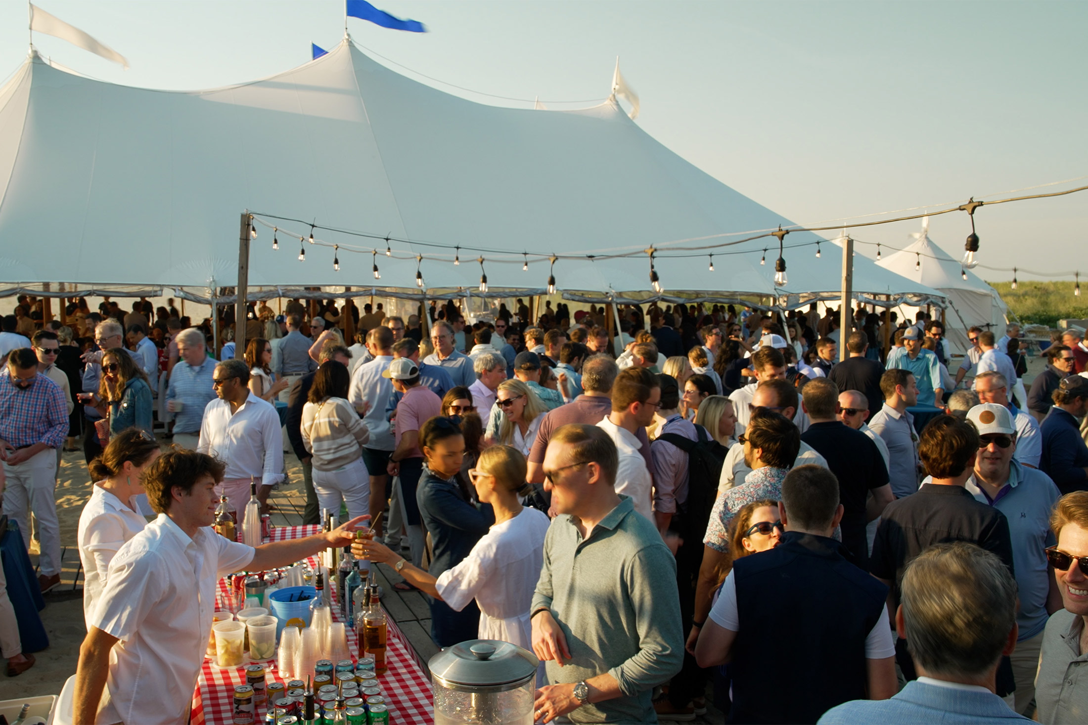 杰富瑞在南塔基特马萨诸塞州的杰蒂海滩上举办的龙虾和蛤蜊烧烤派对。来源:杰弗里斯在送别晚宴上,杰弗里斯在受欢迎的海滨餐厅沙滩酒吧提供了家庭式的蛤蜊烧烤。今年,一顶全尺寸的马戏团帐篷和一排排餐桌容纳了600多名与家人一起出席的宾客。客人们打开蟹钳,将龙虾蘸入黄油,身穿“杰弗里斯尼安塔基特2024”围嘴。一个较小的相邻帐篷里摆满了沙滩玩具和一个供孩子们彩绘贝壳的站点。