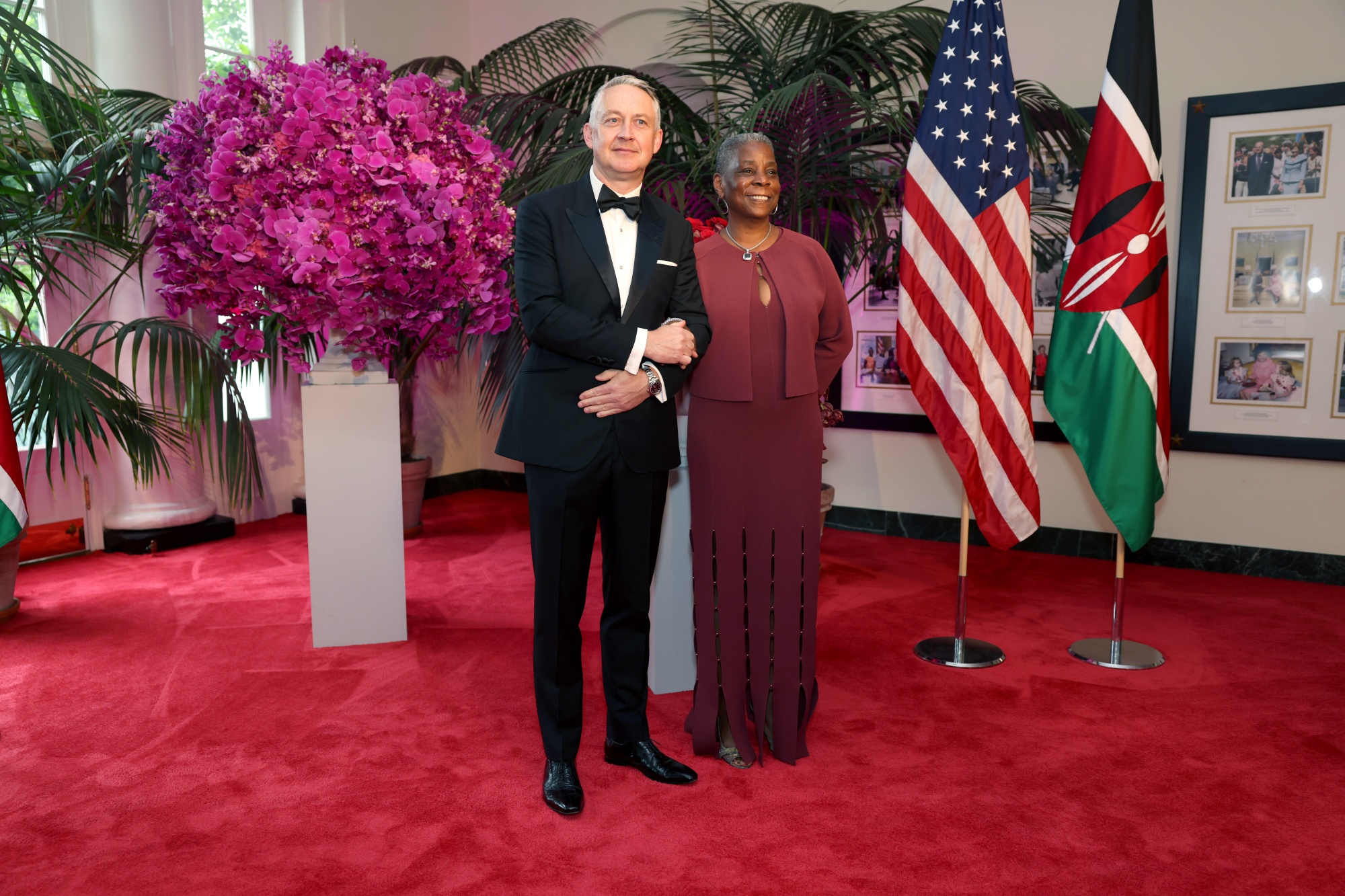 尤苏拉·伯恩斯(Ursula Burns),Teneo Holdings LLC主席,右,和保罗·基里(Paul Keary),出席由美国总统乔·拜登和第一夫人吉尔·拜登在华盛顿特区白宫为肯尼亚总统威廉·鲁托举行的国宴。2024年5月23日星期四。摄影师:Tierney L. Cross/Bloomberg特朗普承诺在上周与一些美国最大公司的约100位首席执行官在华盛顿举行的会议上,如果他再次当选,将把企业税率降至20%。拜登因为在意大利参加七国集团领导人峰会而缺席了这次聚会,他派遣白宫幕僚长杰夫·齐恩茨代表出席。