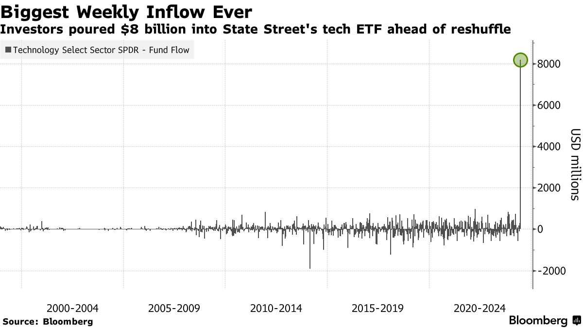 这一突然增长发生在XLK广受关注的季度重新平衡之前,据估计将有超过100亿美元的苹果公司股票被出售,以腾出空间给英伟达公司。据Strategas Securities的ETF和技术策略董事总经理托德·索恩表示,这一巨额资金流入很可能是一项交易的一部分,该基金正试图摆脱已升值的苹果股票,而又不会产生税收。