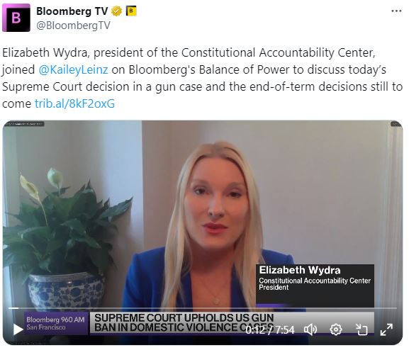 今天在彭博电视台的 权力平衡 早间版节目中,主持人凯莉·莱因兹采访了宪法问责中心总裁伊丽莎白·维德拉,谈论了今天最高法院在一起枪支案件中的裁决以及即将出台的本学期决定。