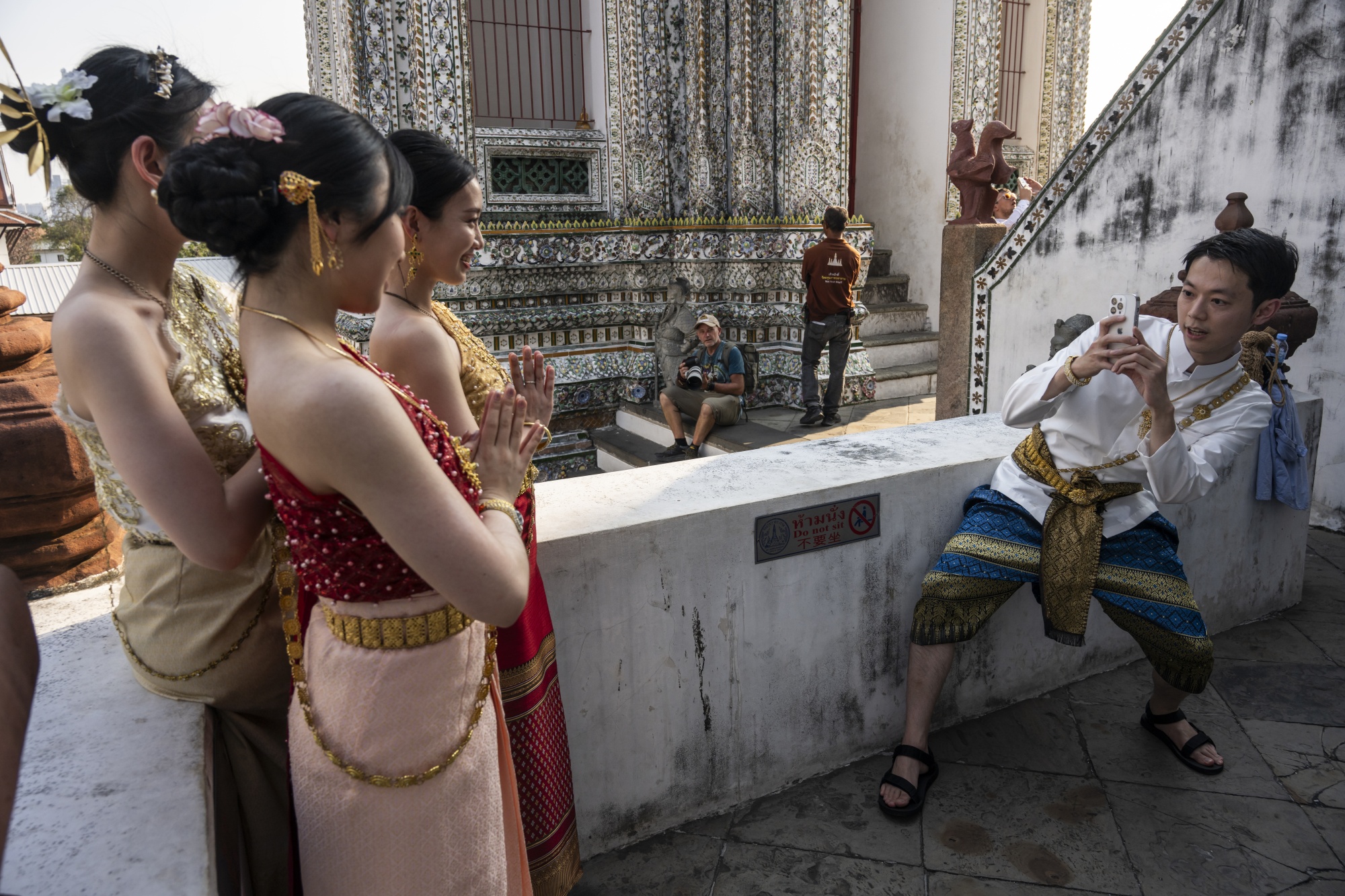 中国游客穿着泰国传统服装在曼谷的暹罗拉查瓦拉拉玛哈威善寺庙合影。摄影师:Sirachai Arunrugstichai/Bloomberg日本和泰国位列中国游客今年夏天出境旅游的亚洲目的地榜首,作为全球最大的旅行者市场,他们寻找性价比高的度假胜地。