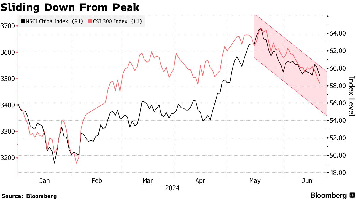 随着中证300指数连续第五周下跌,疑虑再次涌现。令人担忧的是疲弱的数据。中国的房价在五月份以更快的速度下跌,该国最大的互联网公司正在通过大规模折扣来吸引顾客参加“618”购物节。