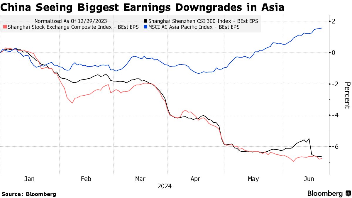 由于深化的房地产市场低迷和疲弱的零售销售打击了信心,关键中国指数的盈利预期今年以来在亚洲遭到最大幅度的下调。自5月中旬达到高点以来,股市失去了动力,MSCI中国指数下跌超过8%。