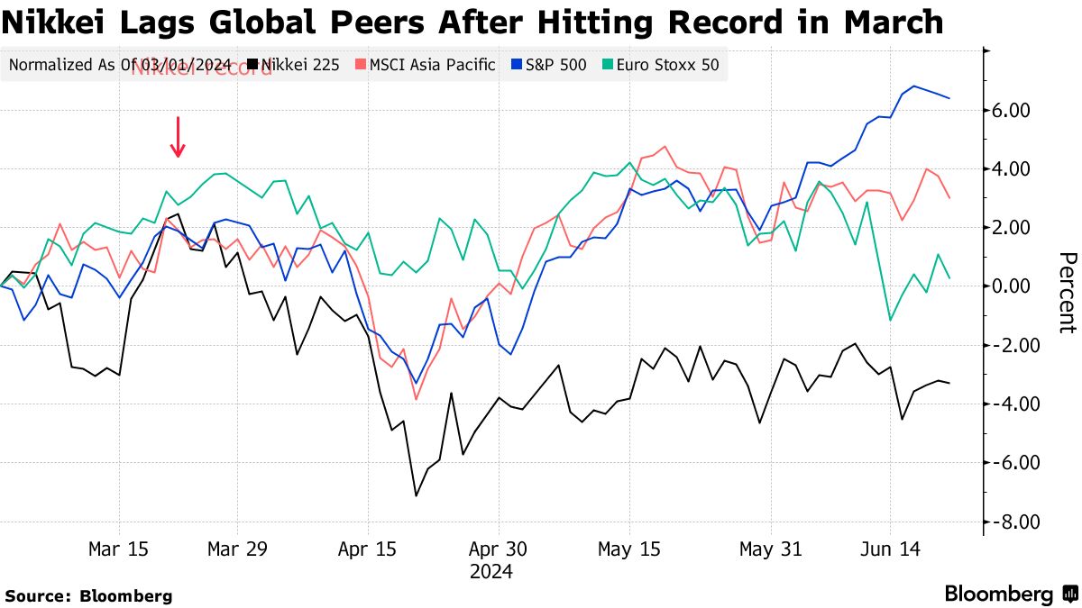 日本蓝筹日经225指数自3月22日创下历史新高以来一直停滞不前。与此同时,亚太地区指数在此期间上涨了1%,而美国飙升的S&P 500指数则上涨了4.4%。