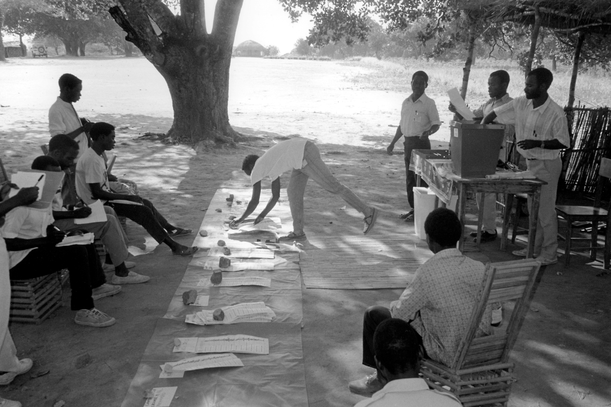 在1994年,摄于莫桑比克扎姆贝兹省一个农村投票站的总统选举计票。摄影师:帕诺斯图片/Redux莫桑比克爱德华蒙德兰大学政治学教授多明戈斯·罗萨里奥解释说,“每五年,技术破产的莫桑比克政府,背负着巨额公共债务,花费数百万购买新的选民登记设备”,“只是为了几年后被扔掉。”