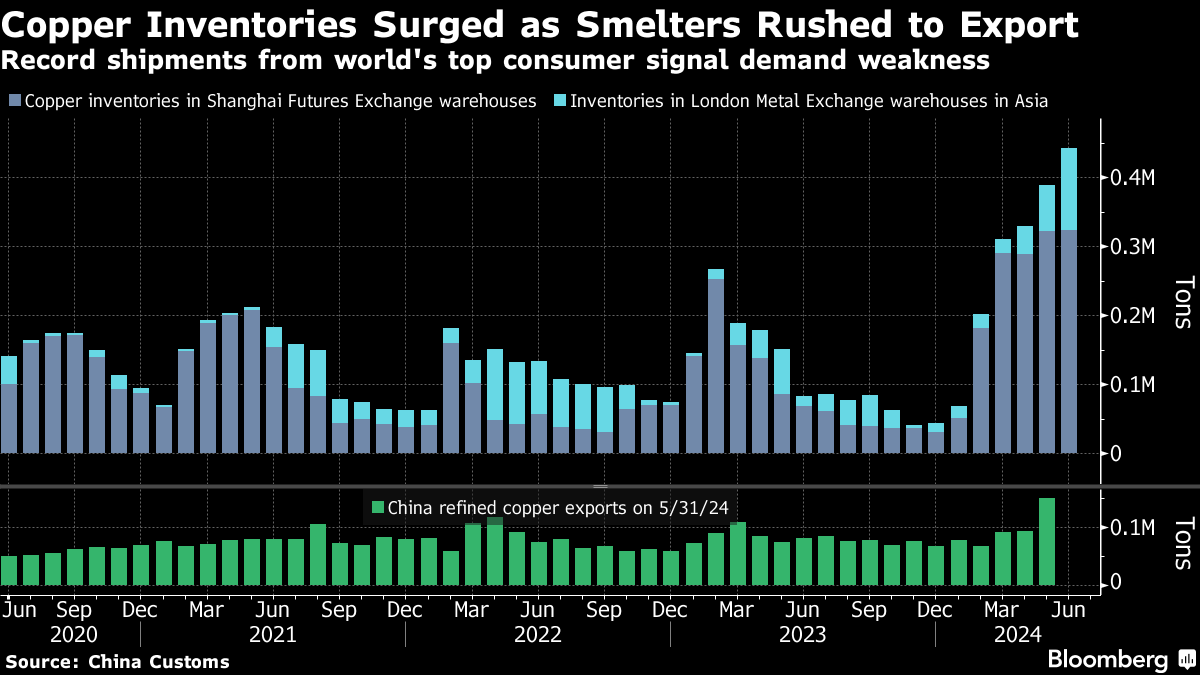 五月份,中国铜出口量达到创纪录的14.9万吨。韩国和台湾的伦敦金属交易所库存——离中国最近的地点——一直在上升。交易商一直在赶着将铜运往美国,以套利价格差异,尽管尚未出现在Comex注册库存中。