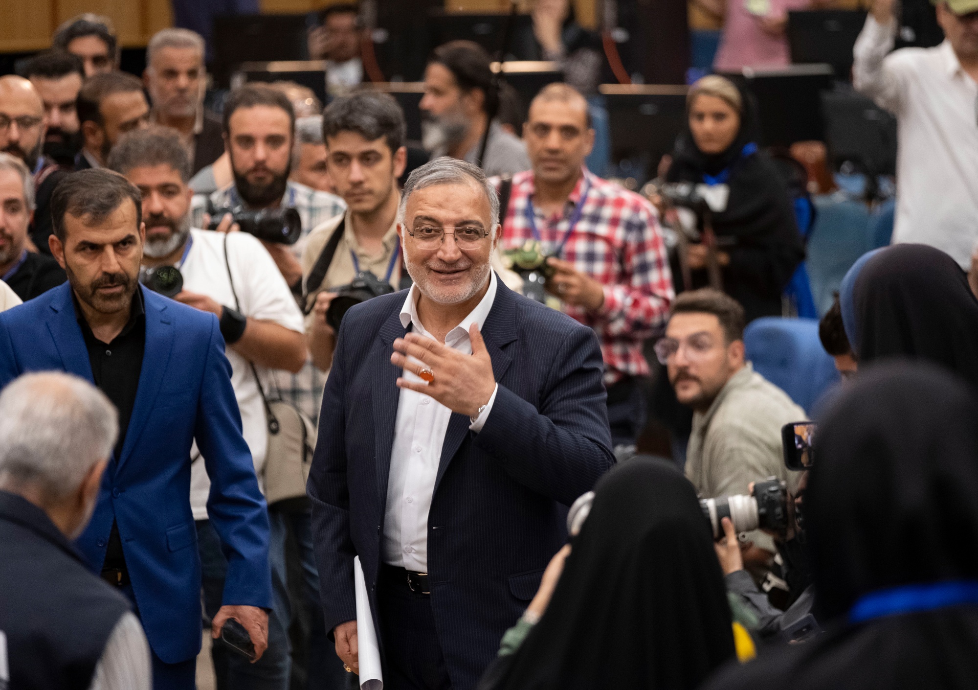 穆罕默德·巴格尔·卡利巴夫,右中,出席德黑兰议会。来源:法新社/盖蒂图片社前德黑兰市长兼现任议会议长卡利巴夫是一位连续第四次参选的总统候选人。 他曾是伊斯兰革命卫队指挥官和伊朗警察部队前负责人,因参与1999年和2000年代初期殴打和镇压学生抗议者而受到批评。