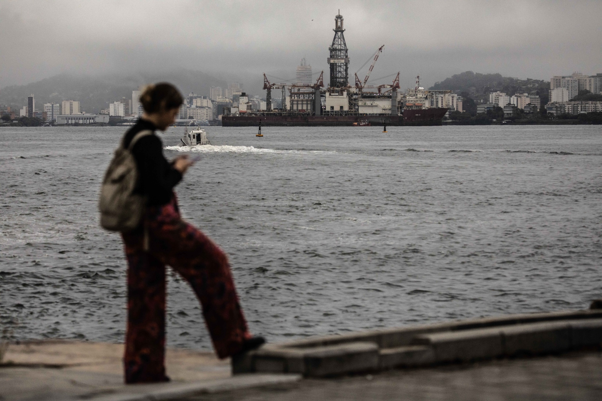 巴西石油公司Petrobras的ODN II NS-42号海洋钻井平台在背景中,在2023年10月里约热内卢进行维护。