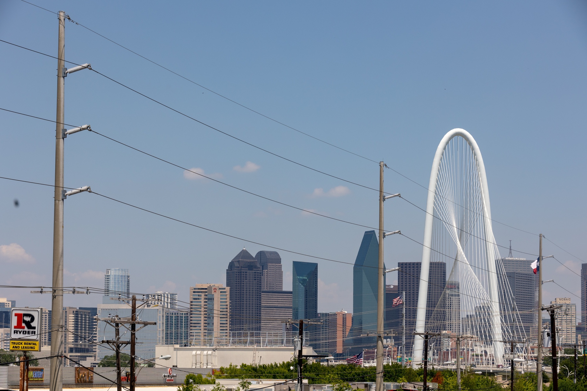 德克萨斯州达拉斯市玛格丽特·亨特·希尔大桥前面有电力线路。